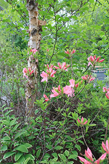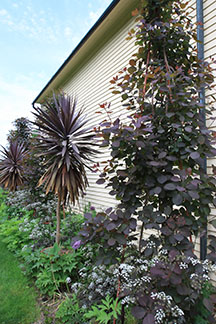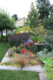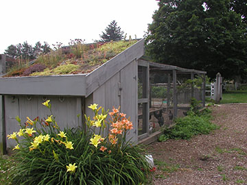 A new arboretum of native trees, shrubs and perennial under-story was established a few years ago. Other garden features include raised beds for cut flowers, strawberries, asparagus and vegetables. A chicken coop supports a “green” roof planted with succulents such as hens and chicks. Several caged beds keep avian visitors from feeding on the raspberries, blueberries and blackberries within. |