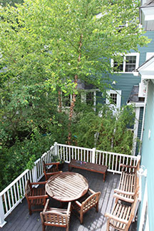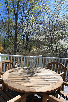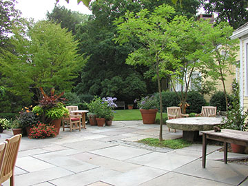 Behind the house is a terrace for entertaining or dining. Three Maackia amurensis (Amur Maackia) surround a mill stone table. Benches, tables and chairs allow ample places to relax and dine. |