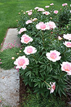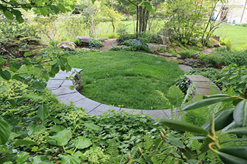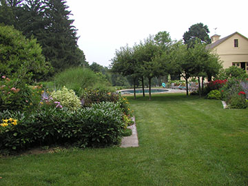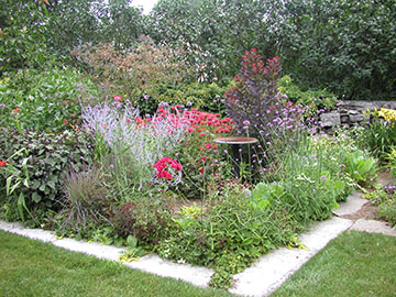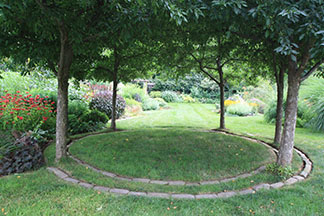 The perennial gardens consist of several island beds and borders, most of which are edged with granite slabs laid flush with the lawn. A circle of Malus ‘Sugar Tyme’ crabapples trees is trained to create a bower in the garden for s shady sitting area. In one corner of the garden, there is a rustic arbor made from red cedar cut from the property. Here also is a small drip fountain and a rustic set of steps leading to a stone seat where one can view the garden. In another shady corner, there is a Moon garden with mainly white flowering and silver foliaged plants. |