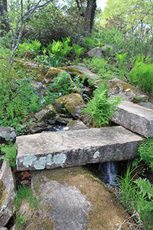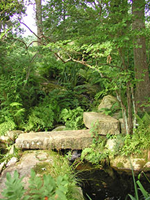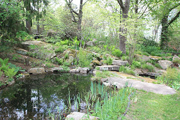 Past the pool area the water / woodland garden begins. A series of ponds and waterfalls cut into the native granite outcropping provide water for plan and animal life. The woodland garden consists of mainly native New England plants. A small semi-circular council ring allows for sitting. Moss is encouraged to grow on the rocks. |