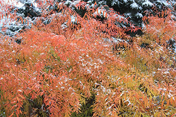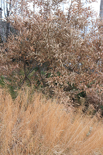 Winter is the season of long shadows, when the sun’s position in relationship to the earth is at its most oblique angle. Winter’s official arrival varies, depending upon how it is defined. Meteorological winter begins on December 1st, astronomical winter arrives on the December 21st, the traditional winter solstice, and horticultural winter starts in mid November after a hard, killing frost. This year’s exceptionally warm October weather came to a abrupt and withering end with the temperature plunging to 22 degrees on November 9th. The extreme cold snap cut off the development of fall color in many plants as well as freeze-drying their leaves, causing unusual and unsightly leaf retention. It was a memorable beginning to this year’s Horticultural Winter.