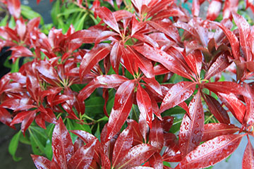 Pieris x 'Katsura' the dwarf variety of Japanese Andromeda offers dramatic, deep wine-red new growth. |