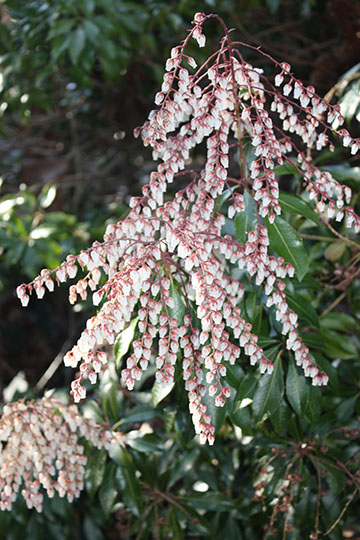 Pieris japonica 'Dorothy Wycoff' produces terminal clusters of bright red flower buds which open to fragrant white bells in early spring. |