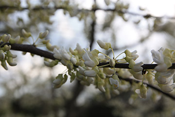 The branches of Cercis canadensis 'Alba' are covered in small white pea-like flowers in early spring. |