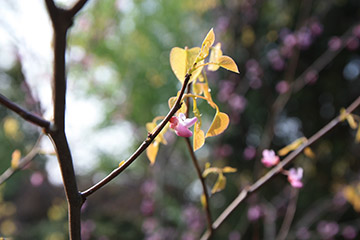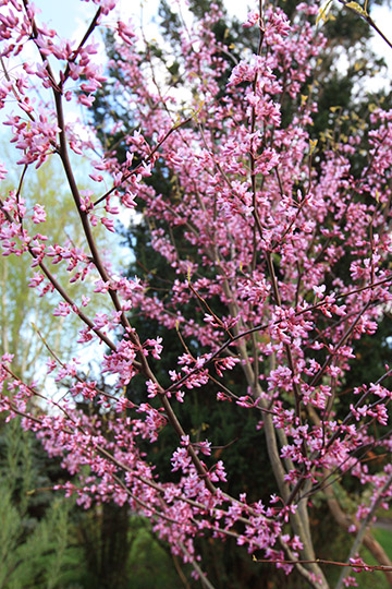 The Eastern Redbud, Cercis canadensis, is a native tree to the southeastern and central U. S. from New Jersey South. In April the bare branches are covered with tiny but showy, purplish-pink, pea-like flowers in clusters of 4 to 8. The heart-shaped leaves appear after the flowers and turn yellow in autumn. The tree grows 20 to 30 feet tall and spreads 25 to 35 feet in width. The shape is rounded to broad with a flattened top with upright branching. Best in full sun to light shade with moist, well-drained deep soil. Cercis canadensis ‘Alba’ is a white flowering form. There are also a few cultivars with dramatically colored leaves. ‘Hearts of Gold’ has leaves that emerge red, maturing to gold and are burn resistant even in full summer sun. The leaves of ‘The Rising Sun’ emerge deep golden orange and matures through shades of orange, gold and yellow to a speckled lime green. New leaves appear throughout the summer, resulting in a mix of colors. ‘Forest Pansy’ is a purple leaved cultivar with attractive orange and purple fall color. Any of these small native trees are a beautiful addition to the garden.