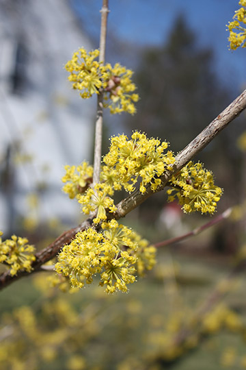 Cornus mas, the Cornelian Cherry Dogwood blooms in late March to early April. |
