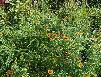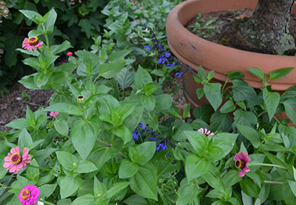 | Zinnias for the butterflies and salvia for the hummingbirds, a pollinator heaven! | What a happy accident! Persian carpet zinnias blooming through the sweet fern. |