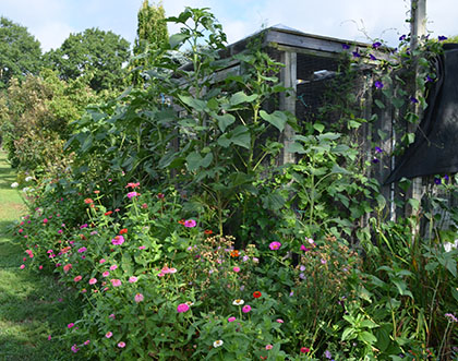 | Zinnias and cosmos, along the Vegetable Garden path, with scarlet runner beans and purple hyacinths beans climbing a post in the background. | The Chicken Coop surrounded by zinnias, sunflowers, scarlet runner beans and purple hyacinth beans as well as morning glories. |