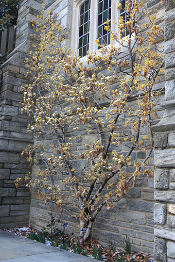 Hamamelis mollis 'Early Bright espalied on a courtyard wall at Swarthmore College |
